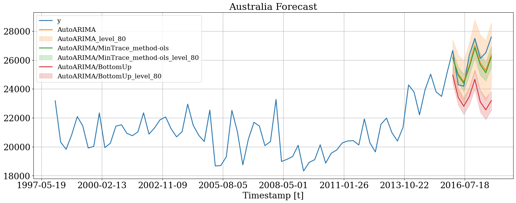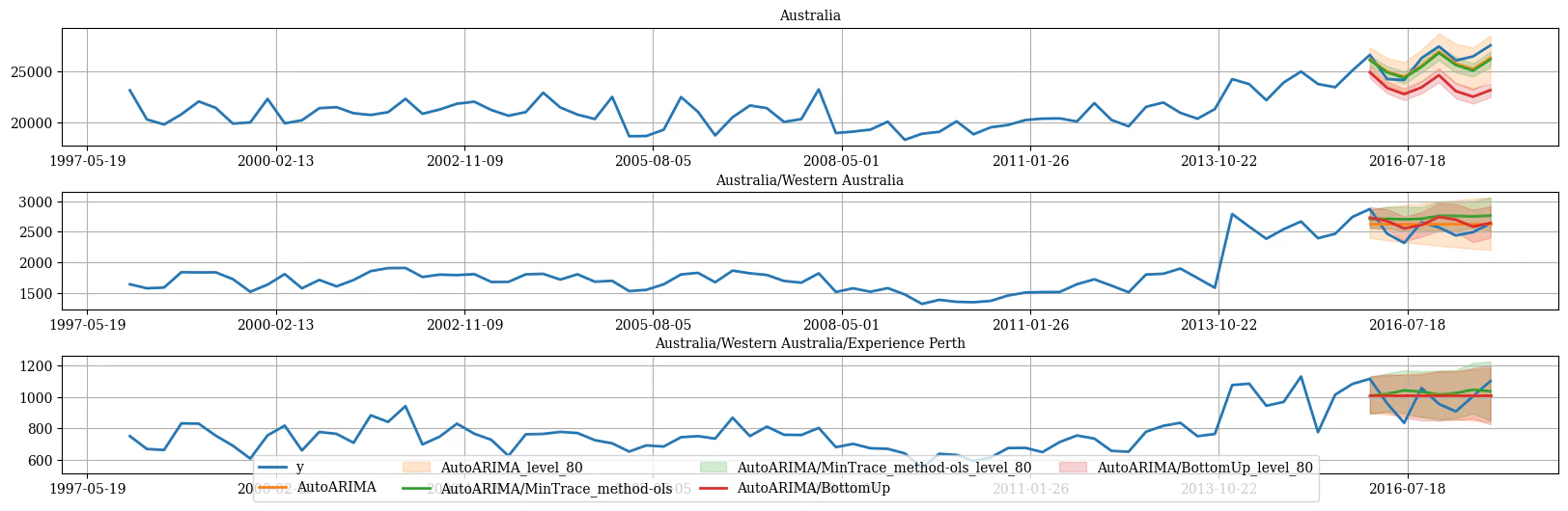 The following cell makes the previous forecasts coherent using theHierarchicalReconciliation class. In this example we use BottomUp
