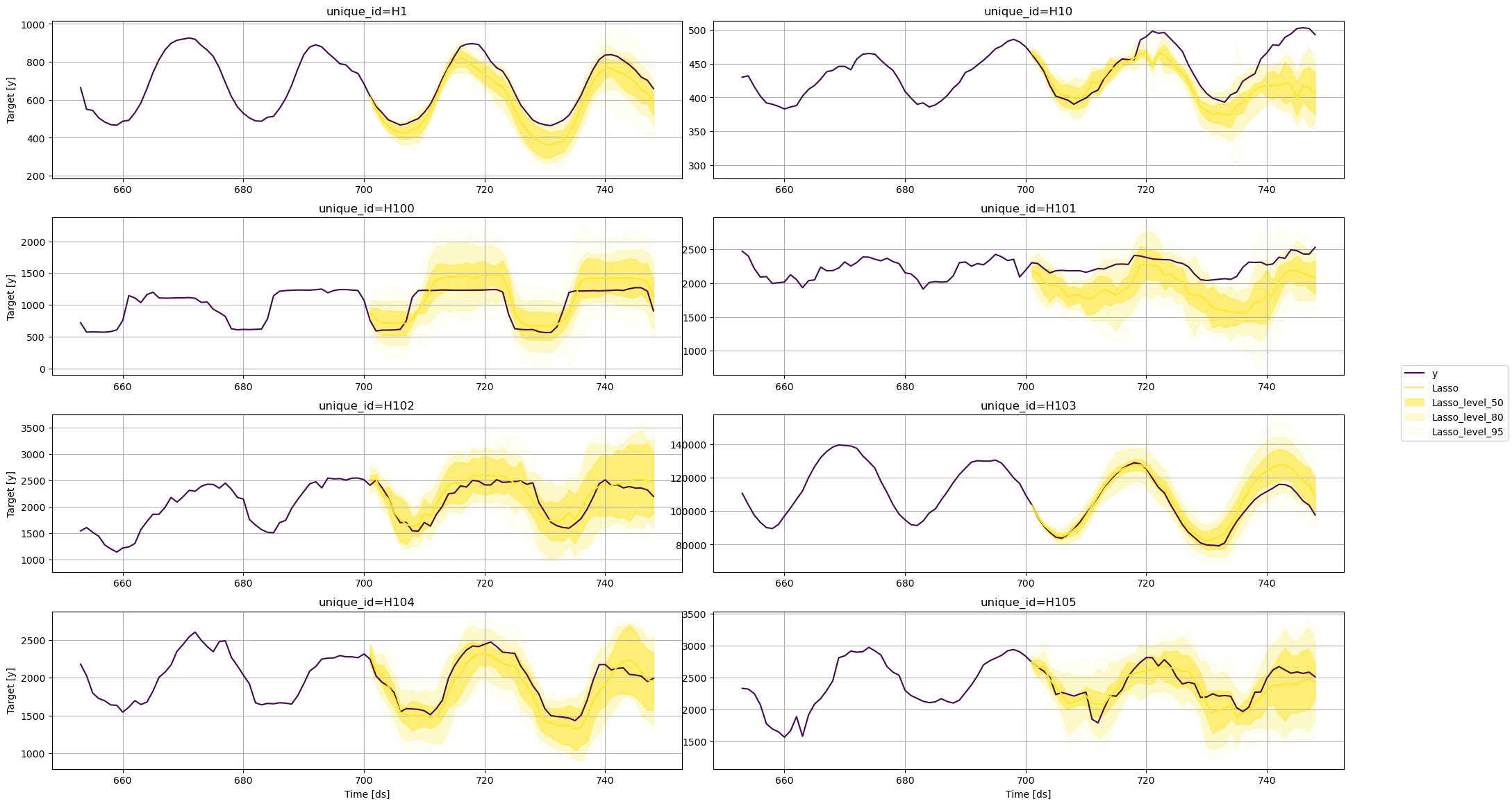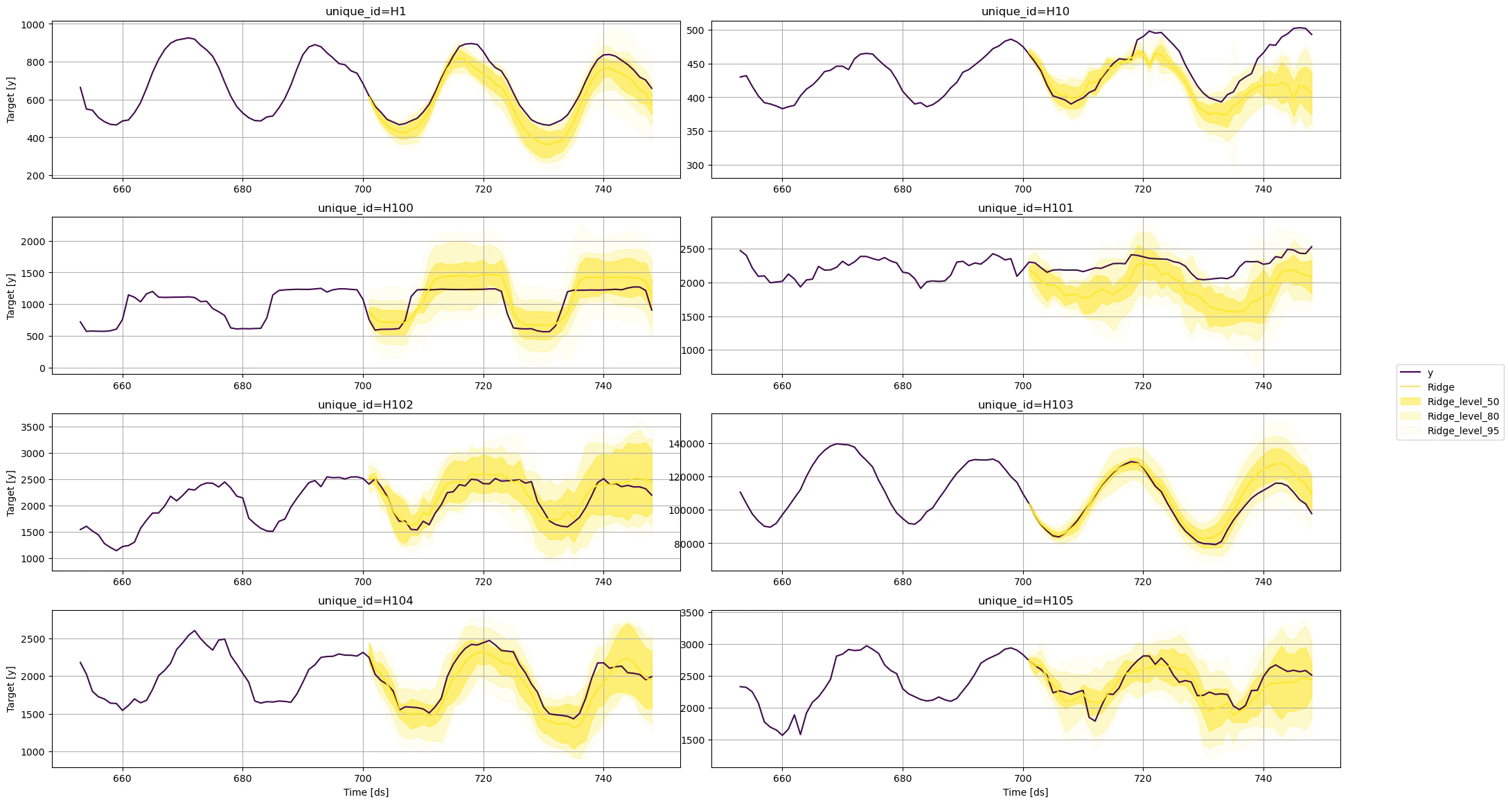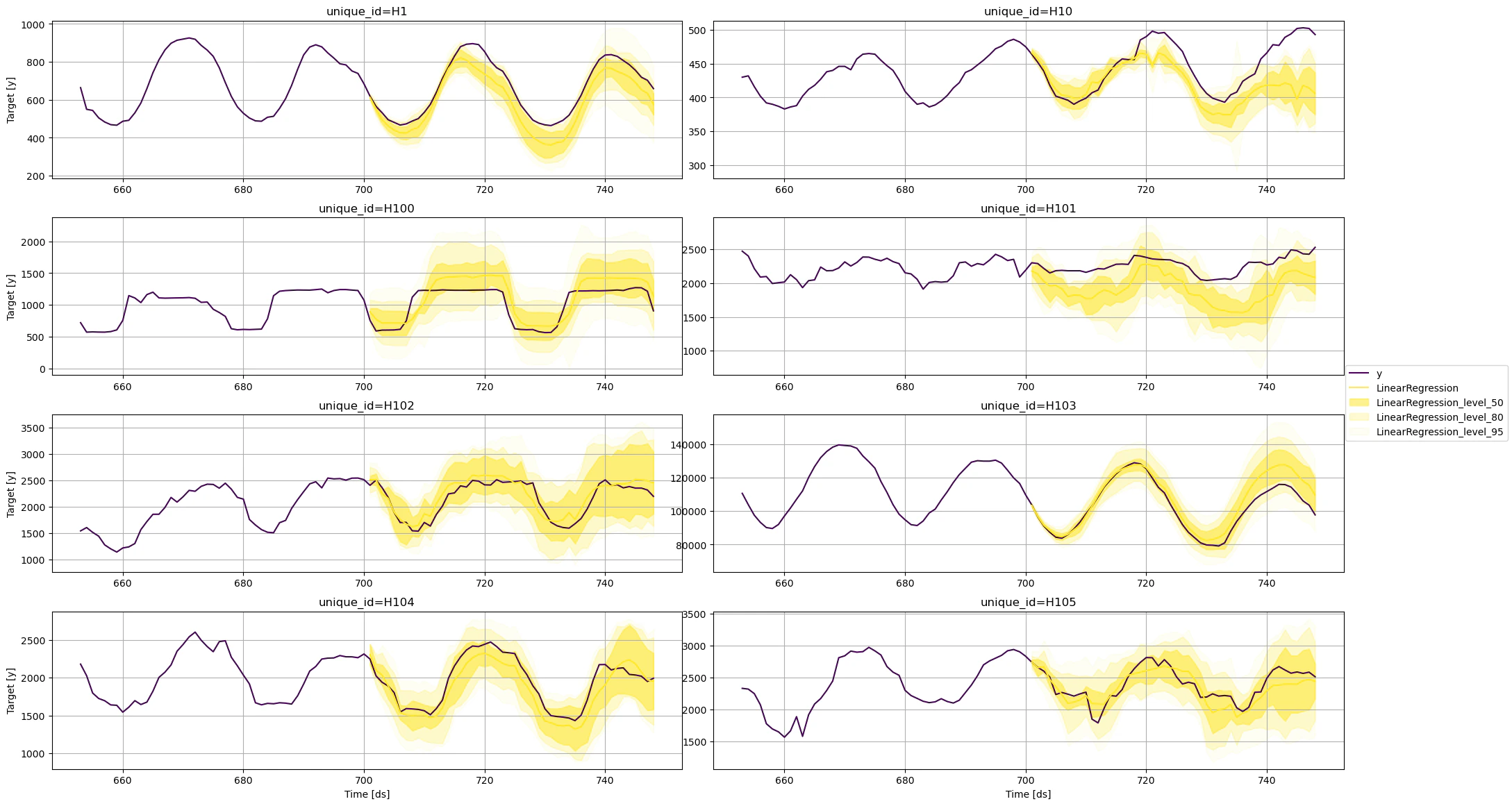 horizon: An integer that represent the forecasting horizon. In this case, weβll forecast the next 48 hours.level: A list of floats with the confidence levels of the prediction intervals. For example,level=[95]means that the range of values should include the actual future value with probability 95%.