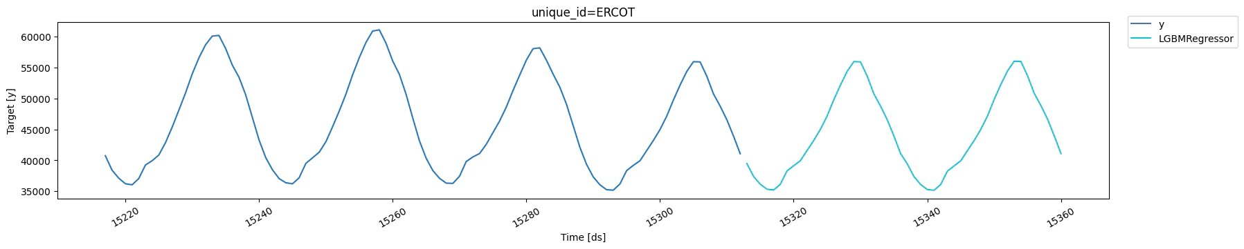 MLForecast(models=[LGBMRegressor], freq=1, lag_features=['lag24', 'lag48', 'lag72', 'lag96', 'lag120', 'lag144', 'lag168', 'exponentially_weighted_mean_lag48_alpha0.3'], date_features=[], num_threads=1)