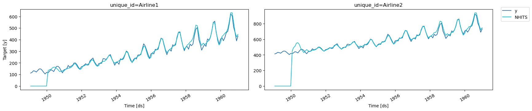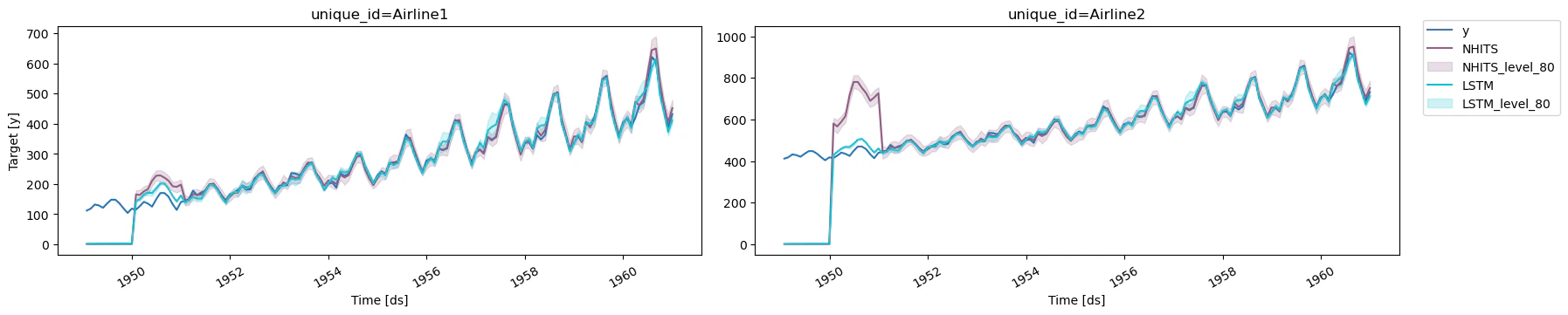 We can also show insample prediction intervals for models trained with a distribution loss function. This can be achieved by simply specifying the required level in thepredict_insample function.