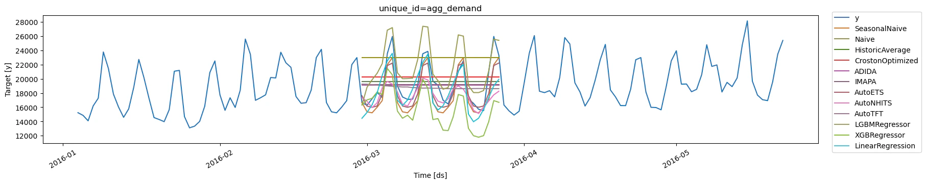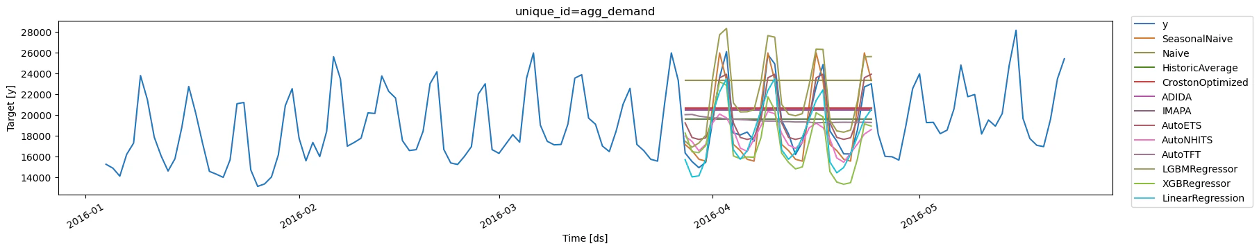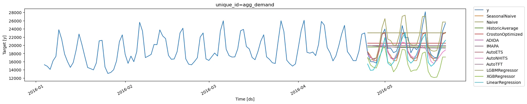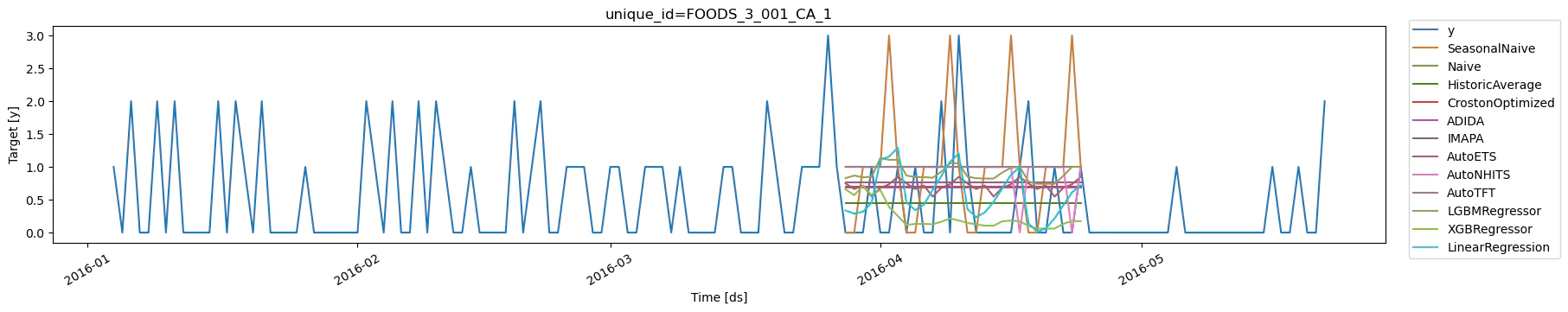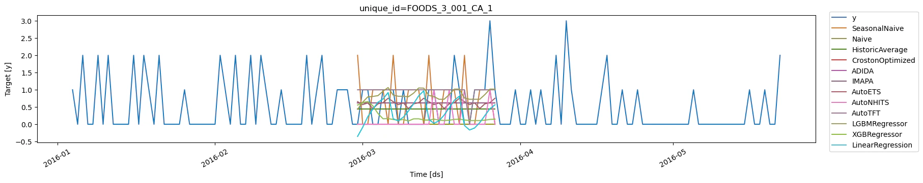 | unique_id | ds | SeasonalNaive | Naive | HistoricAverage | CrostonOptimized | ADIDA | IMAPA | AutoETS | AutoNHITS | AutoNHITS-lo-90 | AutoNHITS-hi-90 | AutoTFT | AutoTFT-lo-90 | AutoTFT-hi-90 | LGBMRegressor | XGBRegressor | LinearRegression | |