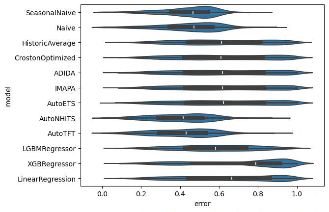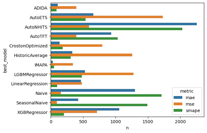 In this section, we will evaluate the performance of each model for each time series.| unique_id | metric | SeasonalNaive | Naive | HistoricAverage | CrostonOptimized | ADIDA | IMAPA | AutoETS | AutoNHITS | AutoTFT | LGBMRegressor | XGBRegressor | LinearRegression | |