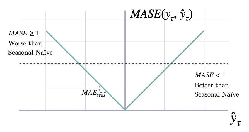 These metrics measure the relative improvements versus baselines.Mean Absolute Scaled Error