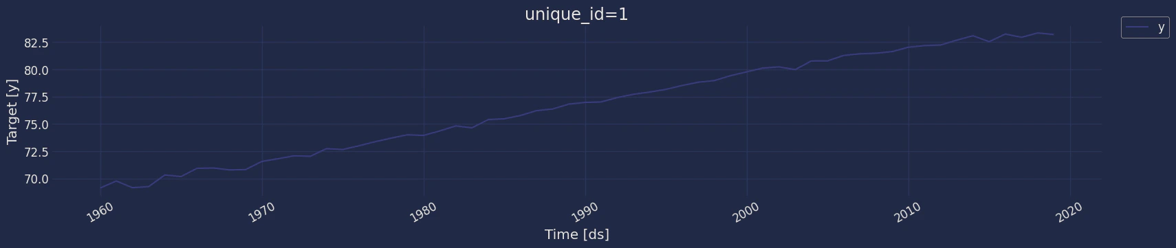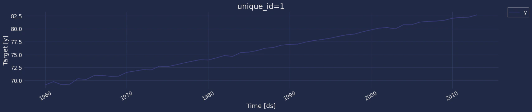 Plot some series using the plot method from the StatsForecast class. This method prints a random series from the dataset and is useful for basic EDA.