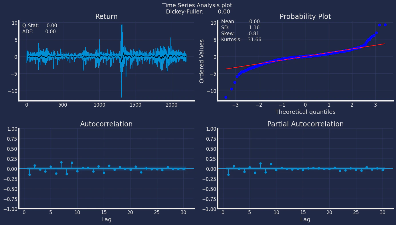 - Model (1) reflects the fat tails and volatility clustering.