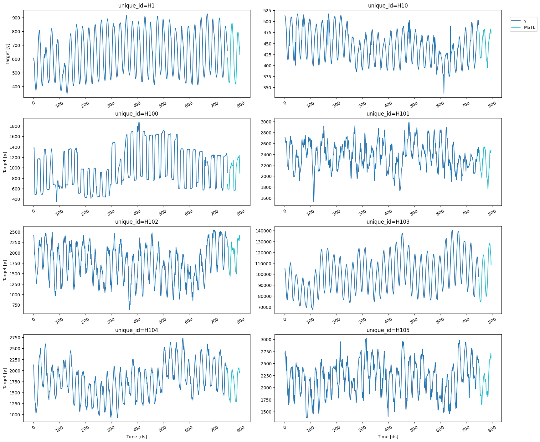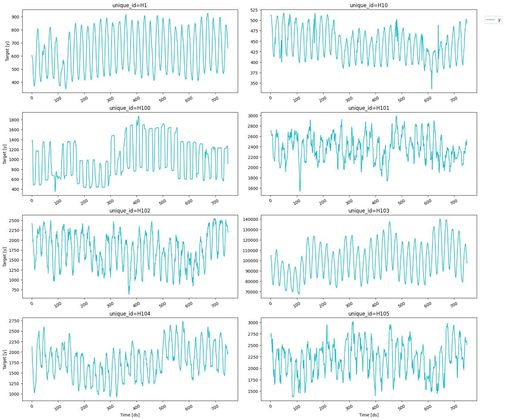 For this example, we’ll use the hourly dataset of the M4 Competition.| unique_id | ds | y | |