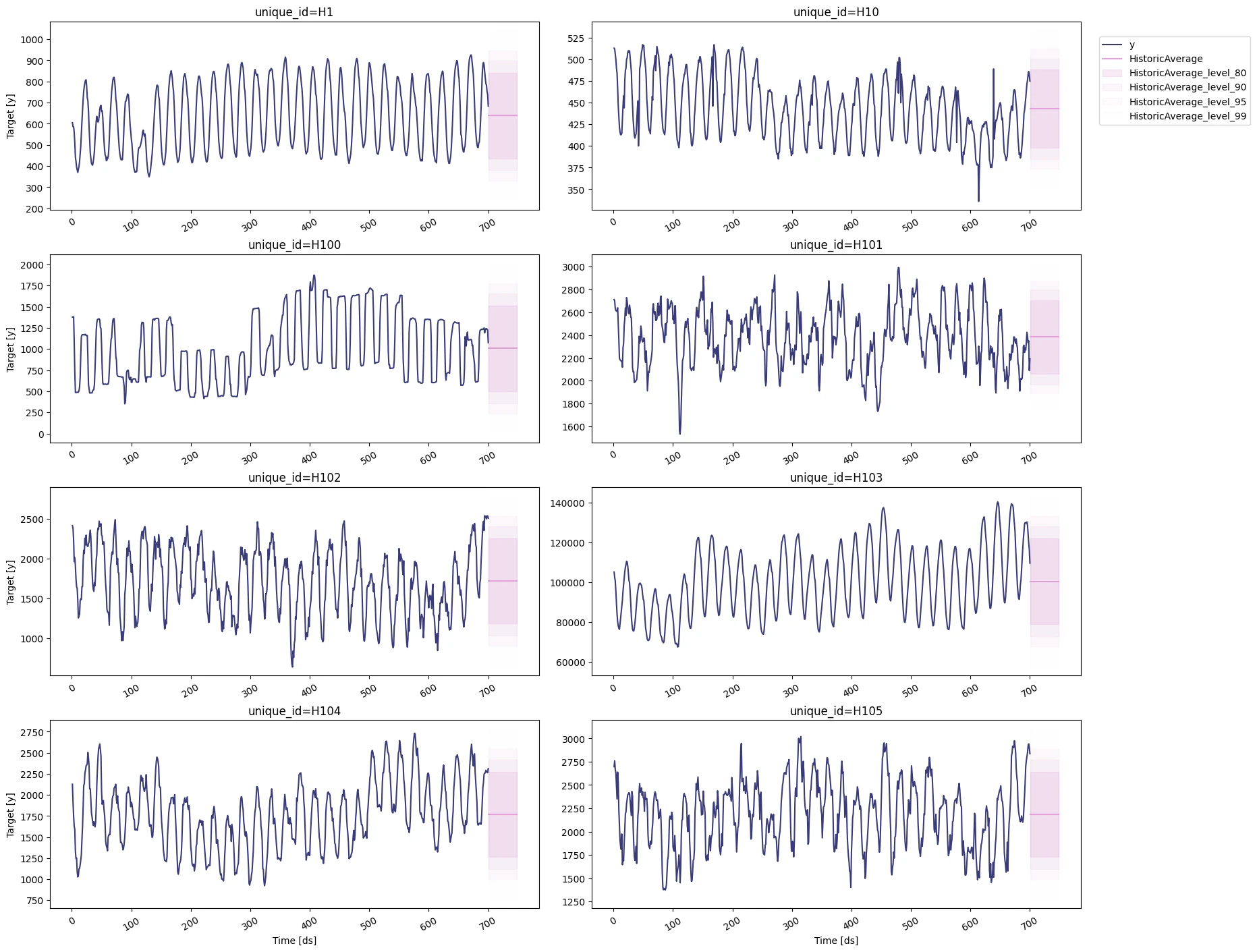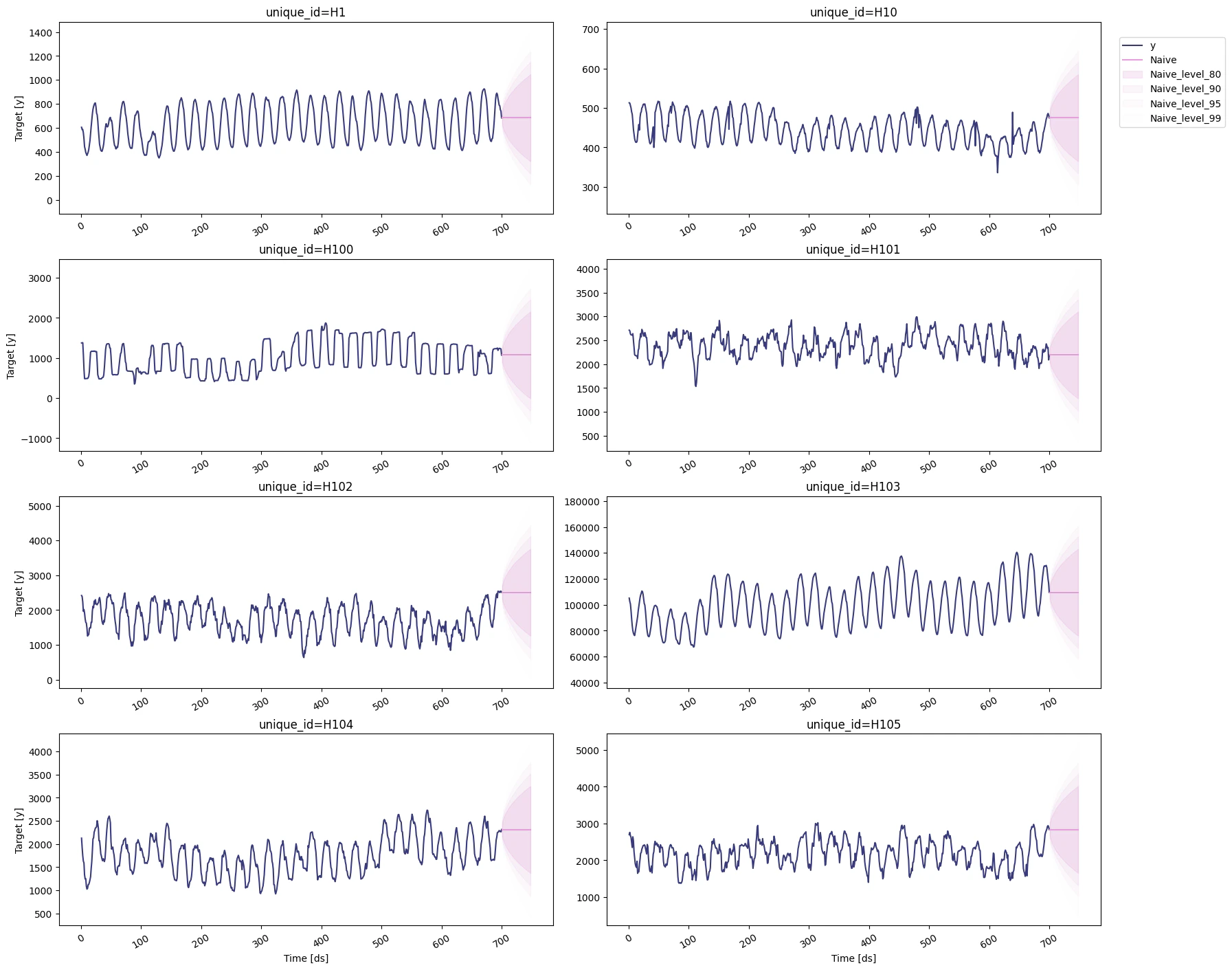 h: An integer that represent the forecasting horizon. In this case, we’ll forecast the next 48 hours.level: A list of floats with the confidence levels of the prediction intervals. For example,level=[95]means that the range of values should include the actual future value with probability 95%.